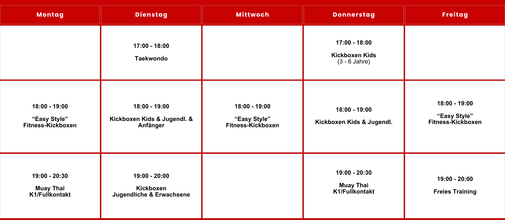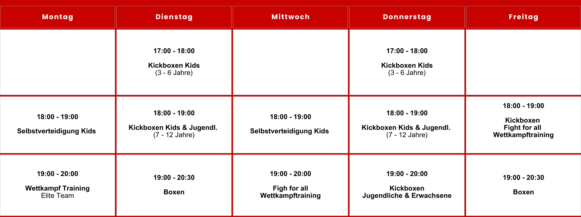Hier findest Du unseren aktuellen Kursplan mit allen Trainingszeiten und Kursen, die wir anbieten. Egal, ob für die Kleinsten oder für Fortgeschrittene – unsere Kurse sind auf jedes Level und alle Altersgruppen abgestimmt. Finde den passenden Termin und starte Dein Training bei uns!